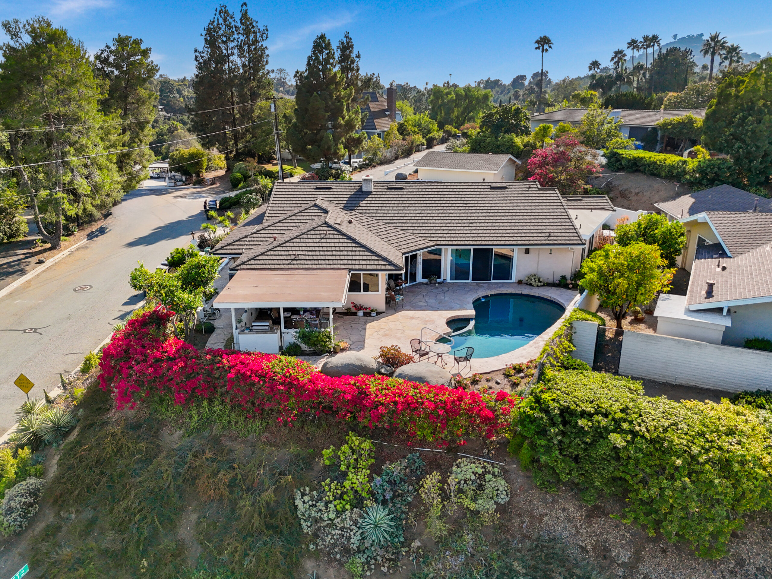 Perched high above the tree-lined streets of Mt. Helix’s coveted Horizon Hills, this custom mid-century ranch delivers a rare blend of single level living and 270° wraparound views. Thoughtfully cared for and extensively upgraded, this home is move-in ready and designed to make everyday living feel extraordinary. The ideal floor plan offers four spacious bedrooms and three full baths, and an abundance of living space which seamlessly connects to the flagstone back patio featuring a sparkling pebble-tech pool and a covered outdoor dining space; perfect for sunset gatherings or peaceful mornings surrounded by nature. Extensive upgrades ensure peace of mind and energy efficiency, including a 16-panel solar system with EV charging, a long-lasting metal roof, dual-paned windows, newer HVAC, fresh carpet, and a brand-new master-suite walk-in shower. Nearly every room frames spectacular views, while the elevated lot creates a sense of seclusion rarely found. El Jardin Verde is a small enclave of just 77 custom homes and is sought after for its quiet charm, tree-lined streets, expansive views, and lack of through-traffic; ideal for walking the dog or connecting with neighbors. With local dining, shopping, and freeway access just minutes away, this home offers serenity and convenience. Opportunities like this in Horizon Hills are rare, so schedule your private showing today and discover why this neighborhood is so highly sought-after.